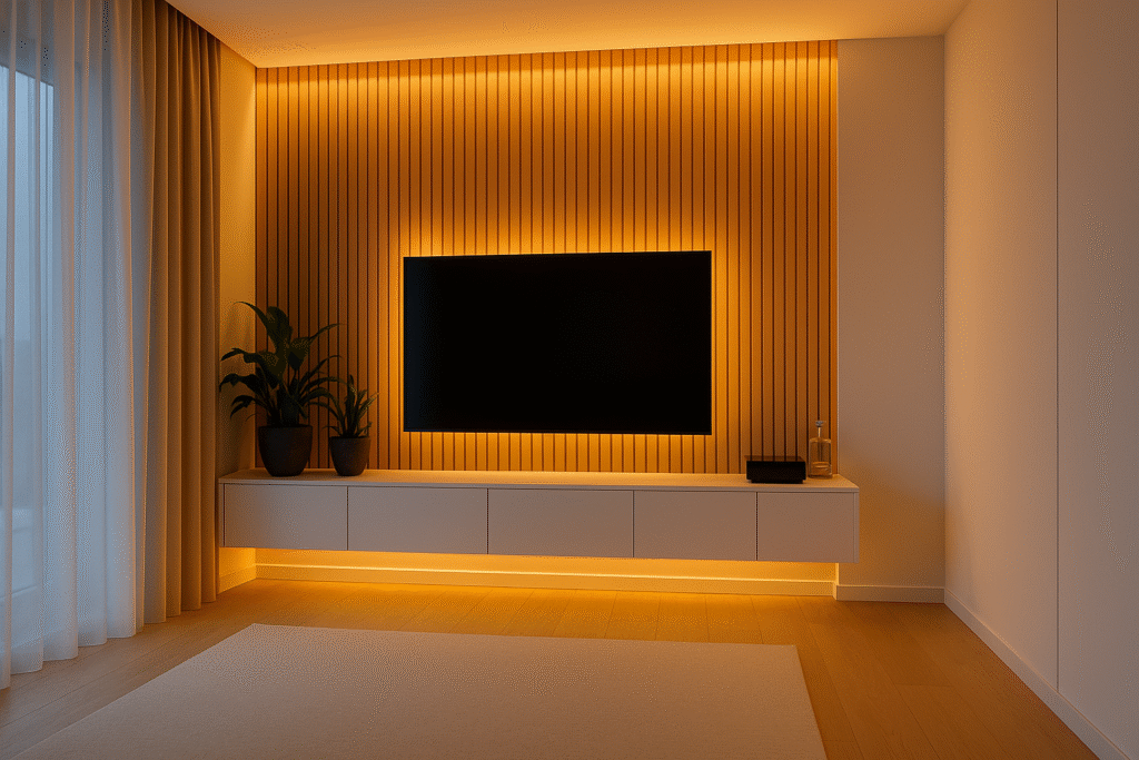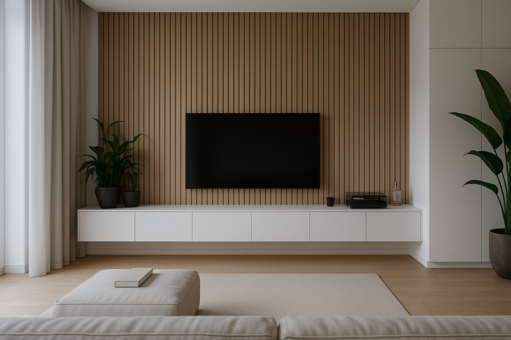A calm, modern focal point that lets the architecture breathe. Vertical wood slats span the wall to frame a low-profile, wall-mounted TV, while a matte-white floating cabinet keeps components hidden and the floor visually open. Soft daylight from the left drapes across the slats, emphasizing their natural texture; the right side remains clean and uninterrupted for a balanced, gallery-like composition.